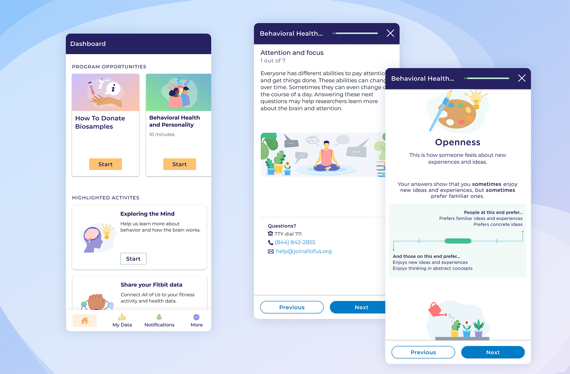The program is an ambitious government-funded health research effort with the goal to retain and engage participants long-term. More than a hundred funded partner organizations work together to run the All of Us Research Program.2 GoInvo was brought in as a small task force, working as the design team for the PTSC under Vibrent Health to support the digital experience in the All of Us PTSC Participant Portal.