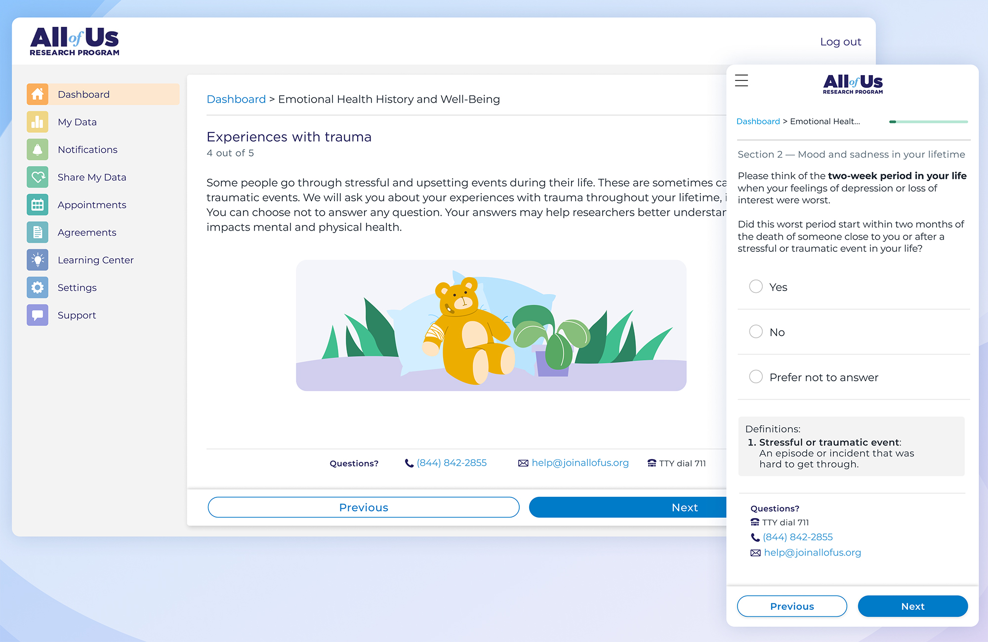 We helped to glue conversations and pieces of the experience together, and communicated the overall user experience across different teams, especially in conversations between NIH and Vibrent Health. We became the go-to team to answer most questions about how the program or experience worked.